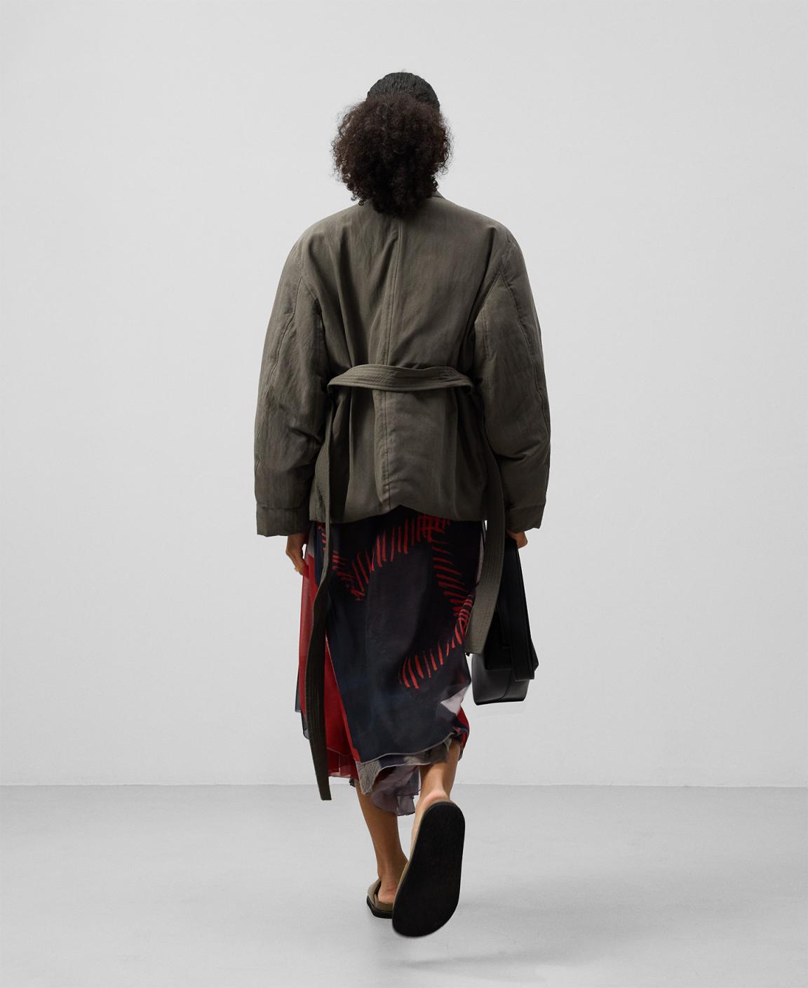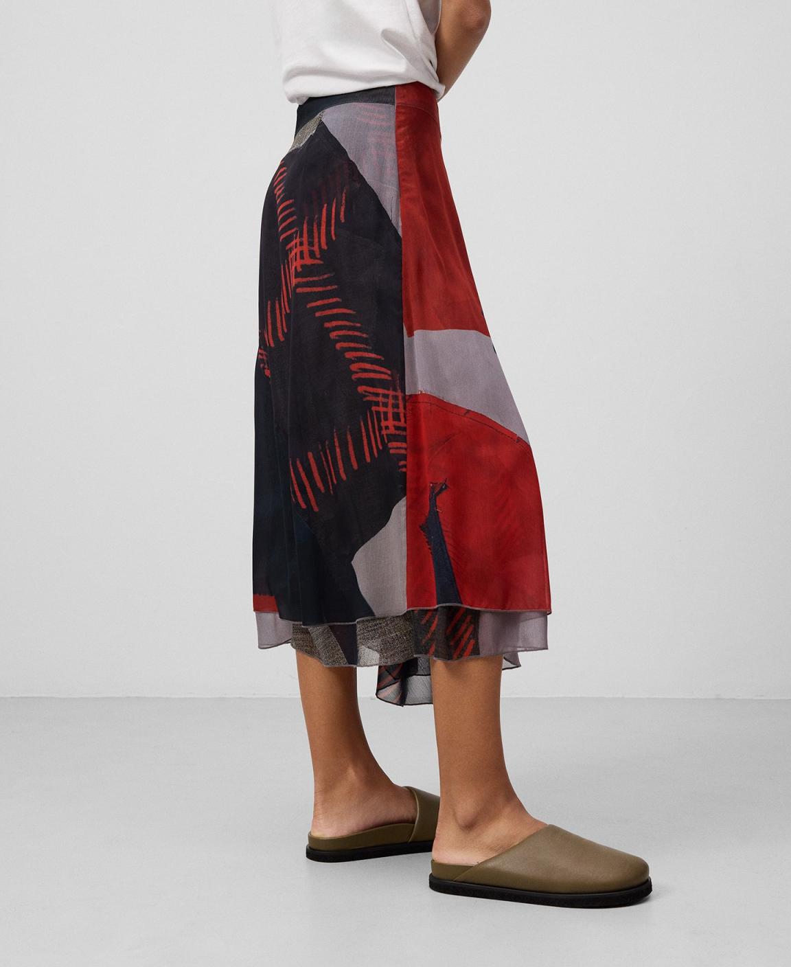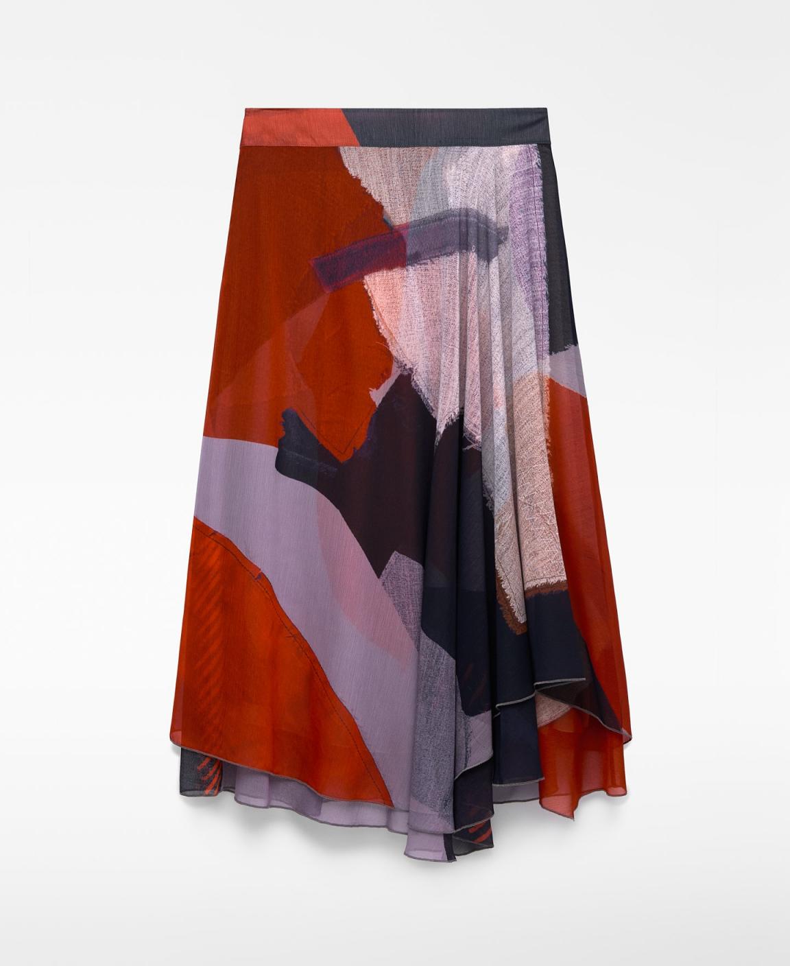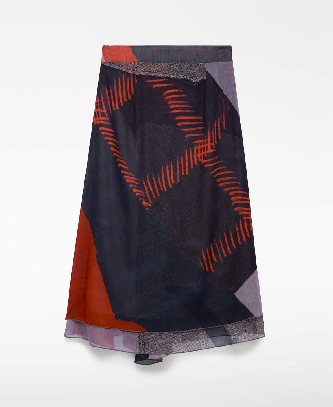 Falda midi estampada mujer. Dos capas semitransparentes. Cinturilla. Gesto en delantero.
